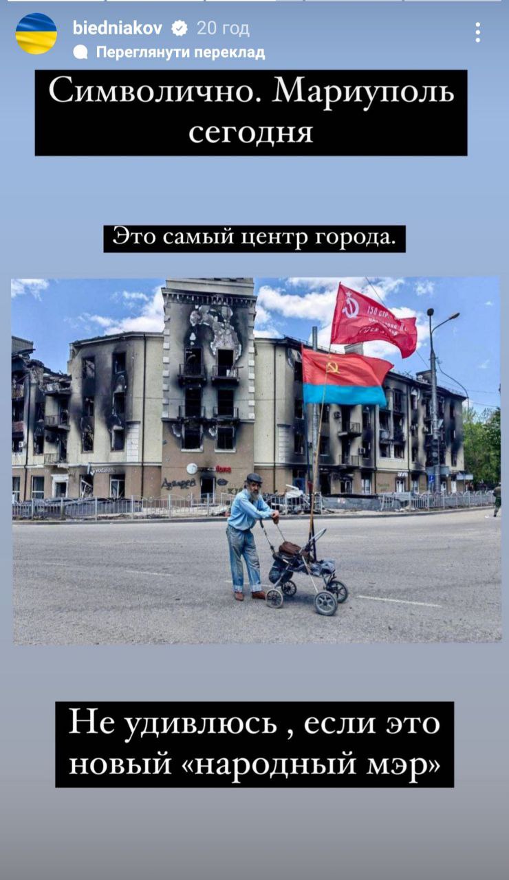 Экс-ведущий "Орла и Решки" поделился в Instagram-"историях" фотографией, сделанной в центре Мариуполя. Судя по всему, оккупанты нашли "бомжа", чтобы сделать красноречивый снимок. В кадре неухоженный старик в грязной одежде позирует на фоне сгоревшего здания, облокотившись на старую детскую коляску, на которую прикреплены советские флаги. "Не удивлюсь, если это новый "народный мэр", - пошутил Бедняков.