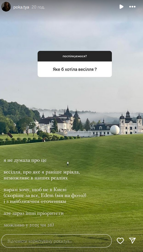 Местом проведения свадьбы Полтавская видит территорию курортного спа-отеля Edem во Львовской области. А само торжество Екатерина хочет провести в кругу близких людей и не раньше 2025 года, а, возможно, и в 2026 году.