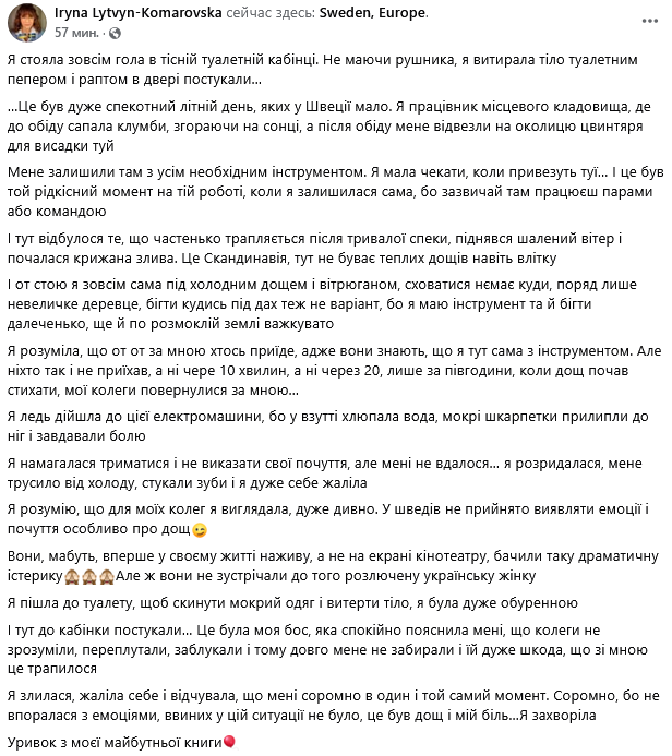 "Я едва дошла до этой электромашины, потому что в обуви хлюпала вода, мокрые носки прилипли к ногам и причиняли боль. Я пыталась держаться и не выказать свои чувства, но мне не удалось… я разрыдалась, меня трясло от холода, стучали зубы и я очень себя жалела. Я понимаю, что для моих коллег я выглядела очень странно. У шведов не принято проявлять эмоции и чувства особенно о дожде. Они, вероятно, впервые в своей жизни наживу, а не на экране кинотеатра, видели такую драматическую истерику. Но ведь они не встречали до того разъяренную украинскую женщину...", - написала она.