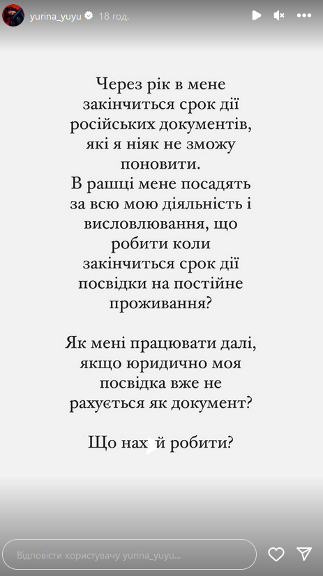 "Я живу здесь [в Украине] уже 12 лет, занимаюсь традиционной украинской культурой, продвигаю ее здесь, создаю украинские альбомы, концерты, учу этому уже очень много лет и... Жду это [украинское гражданство] очень много лет. Я не хочу достичь своего стеклянного потолка. Мне и так уже нет пути к телевидению, радио. Я не выездная и не могу ничего сделать, чтобы продвигать украинскую культуру за границей. Сколько мне еще ждать?", - сказала в "сториз" певица.