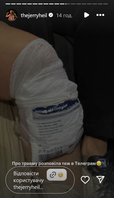 В первом полуфинале "Евровидения-2024" Jerry Heil травмировалась прямо на сцене. Это произошло, когда исполнительница находилась на горе (элемент декораций) и падала на колени во исполнении номера. Артистка отметила, что "немножко перестаралась", из-за чего ударила себя.