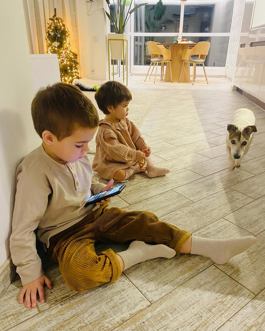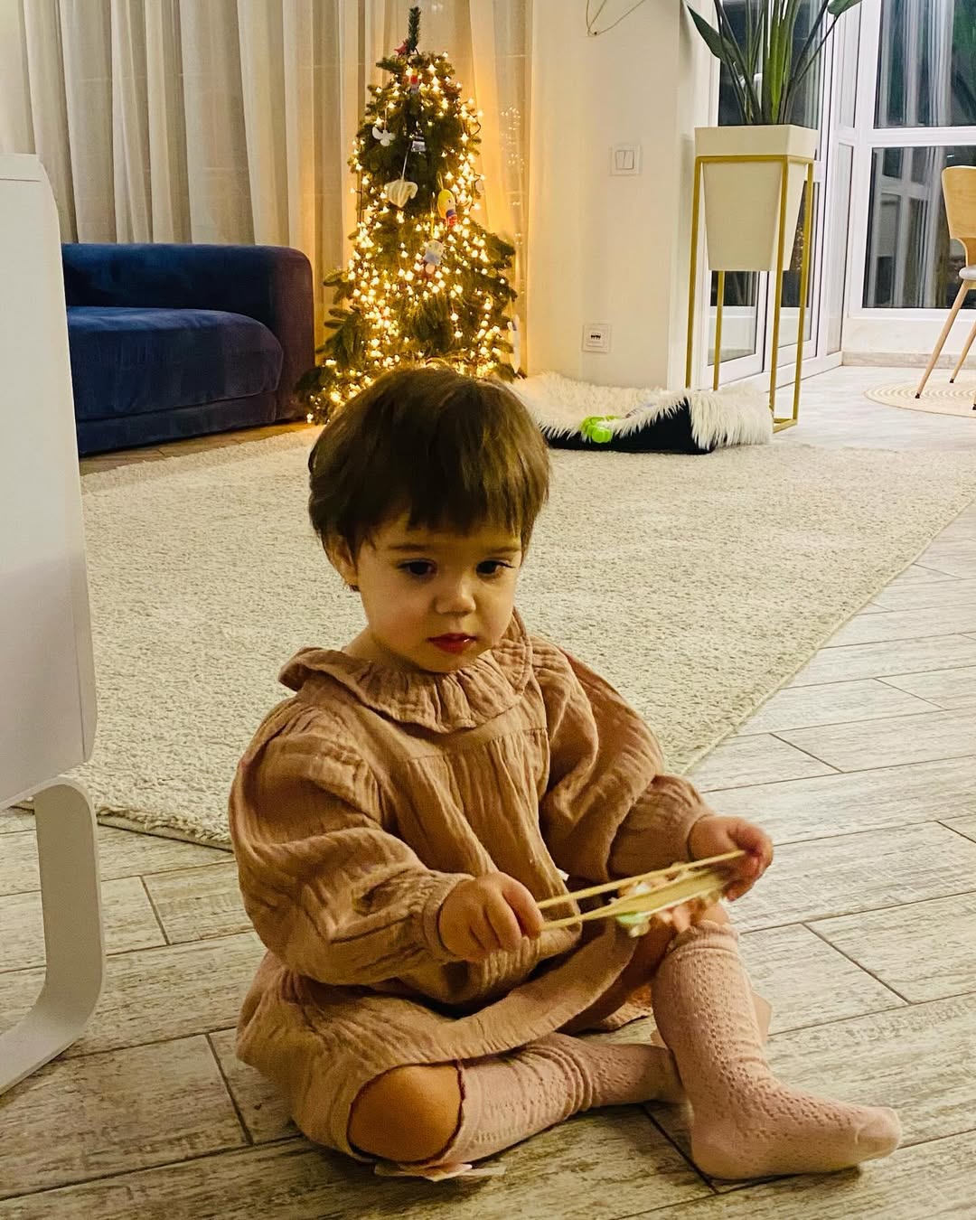 На личной странице в Instagram музыкант поделилась серией домашних фотографий, сделанных в их киевской картире, в которой царит уютная новогодняя атмосфера. Маленькие Лина и Саша запечатлены как в праздничнх образх, так и в повседневных луках. В кадр также попал хвостатый любимец семьи - пес породы джек-рассел по кличке Пиф.