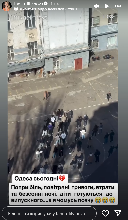 В Instagram-историях кулинарный эксперт показала, как во дворе одной из одесских школ ученики репетируют вальс для выпускного вечера. Эти кадры растрогали известную одесситку. "Одесса сегодня. Несмотря на боль, воздушные тревоги, потери и бессонные ночи дети готовятся к выпускному... А я почему-то плачу", - написала Литвинова.