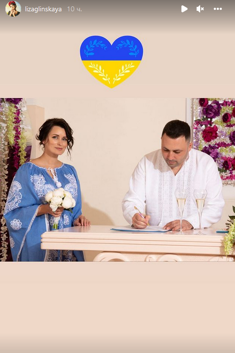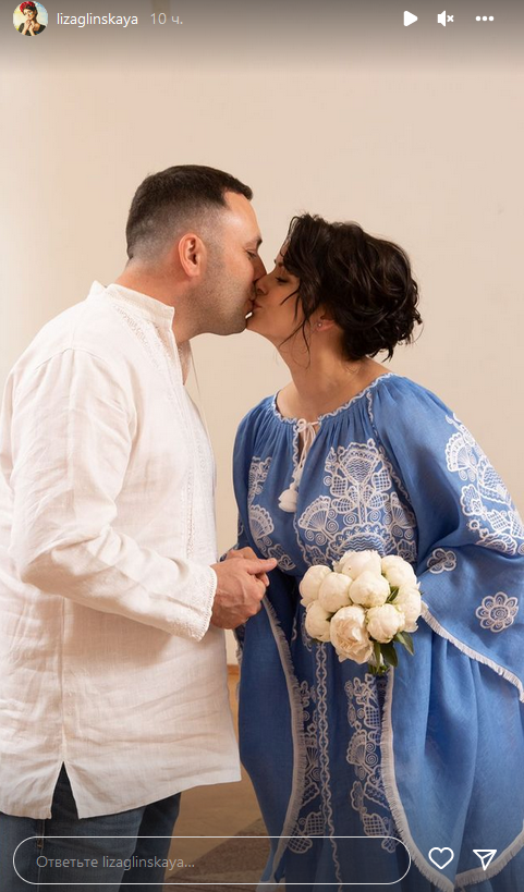 Жених и невеста отказались от классических свадебных нарядов. Лиза была одета в красивое платье-вышиванку небесного оттенка и веночек в цветах украинского флага. Жених выбрал белоснежную вышиванку с узором в тон и голубые джинсы. "Вопреки всему" - написала Лиза.