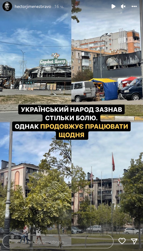 Эктор сделал несколько фотографий на фоне уничтоженных оккупантами многоэтажек и опубликовал их в Instagram. На первом снимке можно увидеть разрушенный дом, в котором до прихода "русского мира" жили мирные люди.