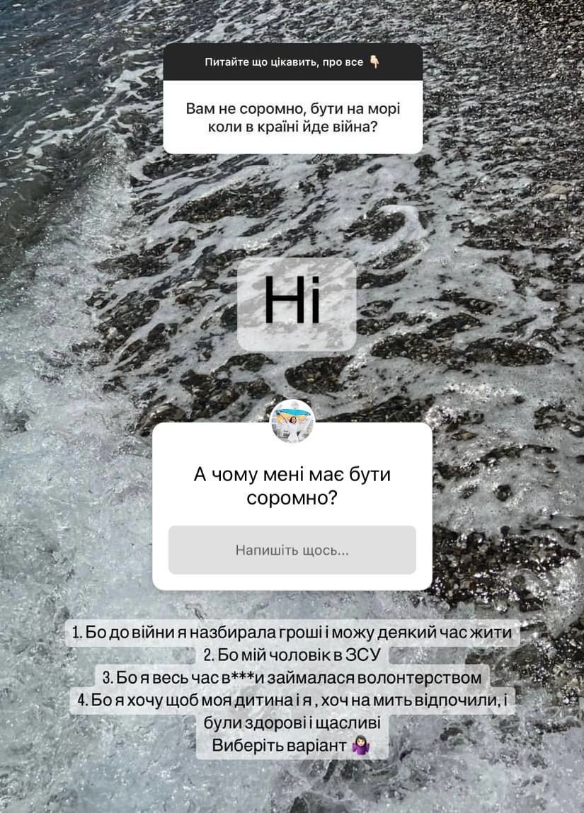 "Нет, потому что до войны я насобирала деньги и могу некоторое время жить. Потому что мой муж в ВСУ. Потому что я все время войны занималась волонтерством. Потому что я хочу, чтобы мой ребенок и я хоть на миг отдохнули и были здоровы, счастливы", - ответила на хейт Денисенко в Instagram.