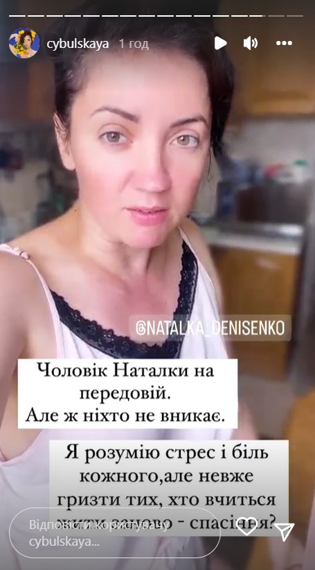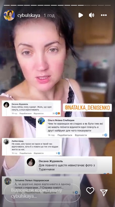 "Я читала новости и увидела статью о том, что Наталья Денисенко сейчас находится в Турции со своим ребенком в отеле. Она проводит там летнее время со своим малышом. Зайдя в комментарии, я прочла кучу хейта. Люди пишут: "Как ты имеешь право сейчас отдыхать, когда в Украине война? Может, ты еще фото выложишь?". Людей не интересует, например, даже то, что муж Наталки сейчас на передовой, в составе ВСУ защищает нас с вами, в том числе тех, кто пишет эти комментарии", - сказала Цибульская.