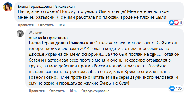 "Сейчас он говорит моими словами 2014 года, а когда мы с ним пересеклись во Дворце Украина он меня оскорбил. За что был послан на х*й. Тогда он бегал и настраивал всех против меня и очень некрасиво отзывался в кругах, за мои действия против России и я об этом знаю. А сейчас пытается быть патриотом забыв о том, как в Кремле снимал штаны! Г*вно? Г*вно… Мне противно читать эти высеры двуличного человека! Я ему не верю и прощать за жалкие Буквы не буду!", - объяснила Приходько.