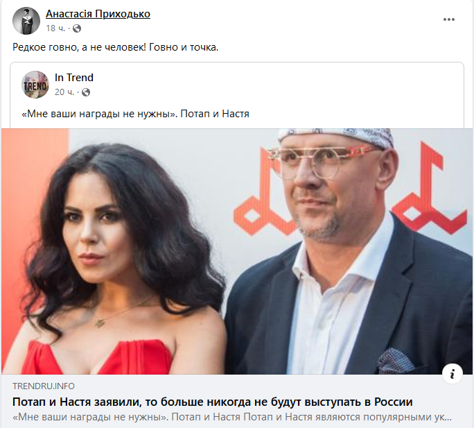 Приходько на своей странице Facebook репостнула новость с заголовком: "Потап и Настя заявили, что больше никогда не будут выступать в России". В подписи к публикации певица назвала рэпера "г*вном". Фолловеры потребовали объяснений, и она выложила все в комментариях.