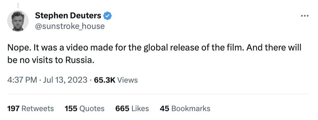 "Нет. Это был ролик, сделанный для глобального релиза фильма. И никаких визитов в Россию не будет", – говорится в комментарии Стивена.