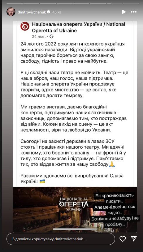Украинскому актеру, бывшему солисту-вокалисту в Киевском национальном академическом театре оперетты Дмитрию Вивчарюку стало противно от сообщения Национальной оперетты, сделанного в третью годовщину полномасштабного вторжения РФ.