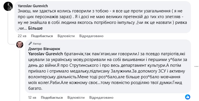 "А потом приехало и получило медальку. За помощь ВСУ и активную волонтерскую деятельность. Меня тогда раз*бало, но больше раз*бало молчание моих коллег. Рабы. Но каждому свое…потому полностью разделяю твои мысли. Гнид много", – добавил Вивчарюк.