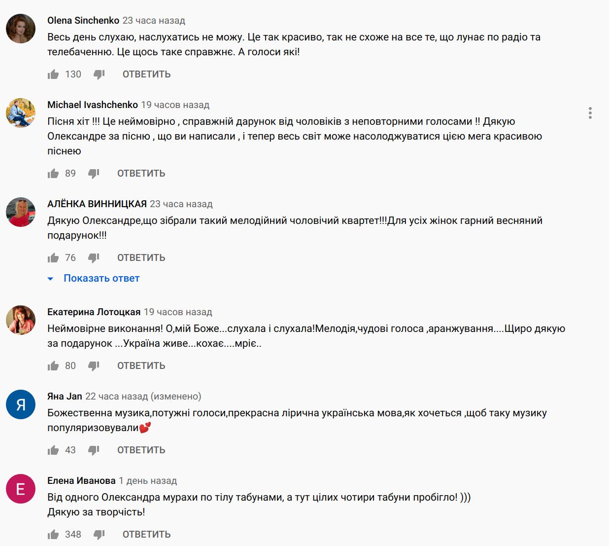 "Весь день слушаю, наслушаться не могу. Это так красиво, так не похоже на все то, что звучит по радио и телевидению. Это что-то такое настоящее. А голоса какие!" - пишут в комментариях. - "Михаил Хома - просто очаровал! Пономарев - как всегда, шикарен, у ALEKSEEVА голос как у хрустального ангела, дух захватывает, и Артем тоже ну очень хорошо спел. Каждый внес что-то свое, давно не слышала таких гармоничных и трогательных выступлений".