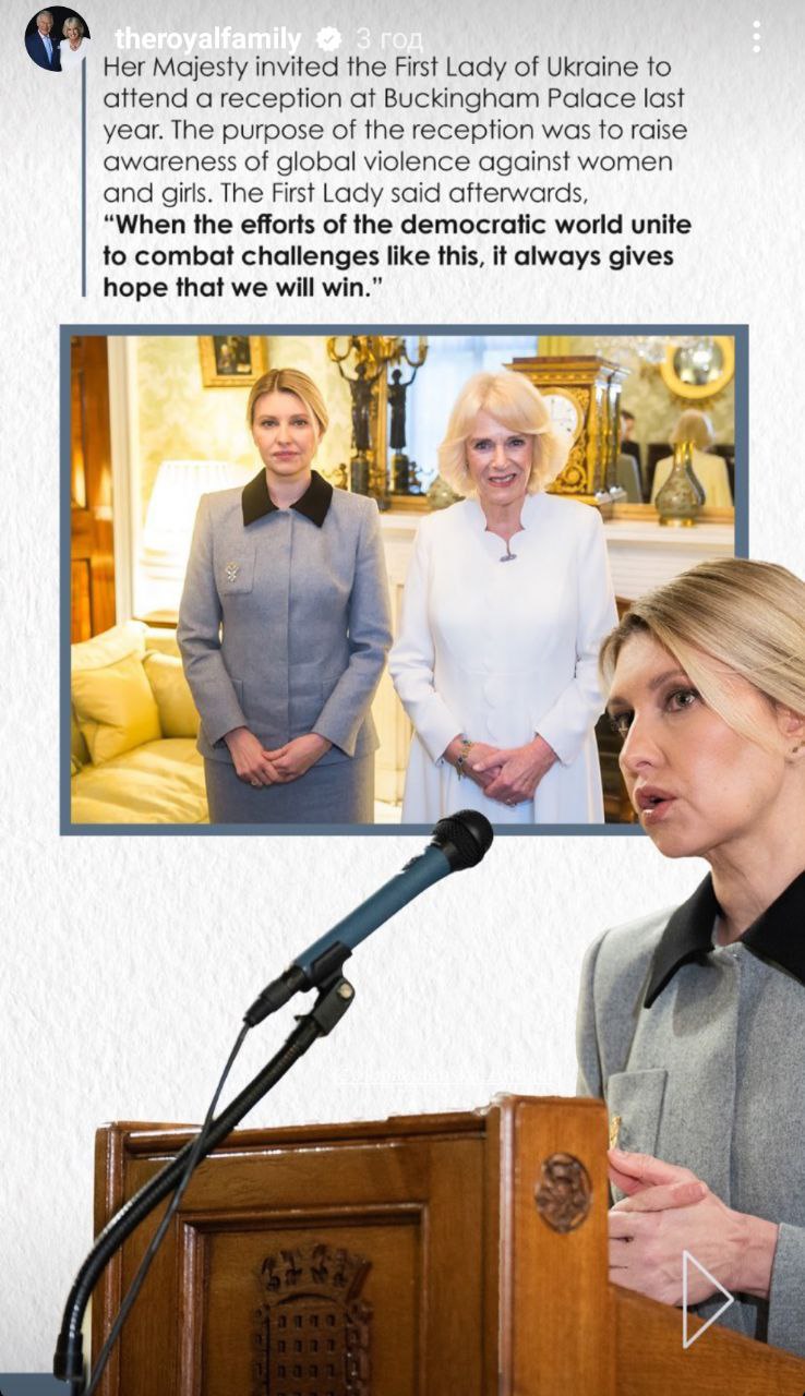 "Ее Величество пригласила Первую Леди Украины посетить прием в Букингемском дворце в прошлом году. Целью приема было повысить осведомленность о глобальном насилии против женщин и девочек. Впоследствии Первая Леди сказала: "Когда усилия демократического мира объединяются, чтобы побороть такие вызовы, всегда появляется надежда на победу"", - гласит подпись.
