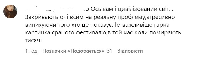 "Как же они все хотят забыть и не видеть того, что происходит в Украине". "Вот вам и цивилизованный мир. Закрывают глаза на реальную проблему, агрессивно выталкивая того, кто это показывает. Им важнее красивая картинка фестиваля, пока умирают тысячи".