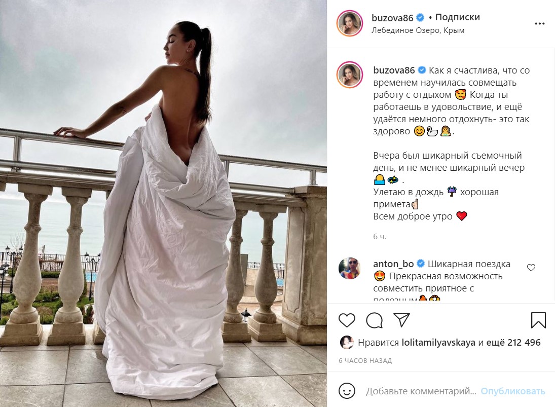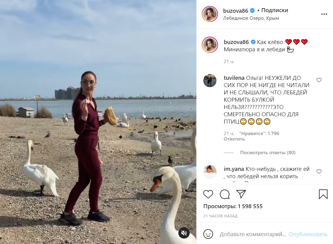 На личной странице в соцсети Бузова поделилась фотографией из местного отеля, а также показала, как кормит хлебом птиц на Лебедином озере в Евпатории (чего, как известно, орнитологи делать категорически не советуют).