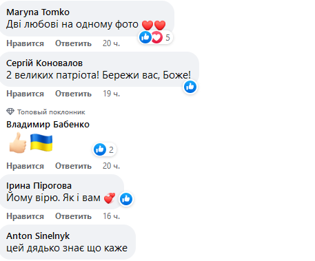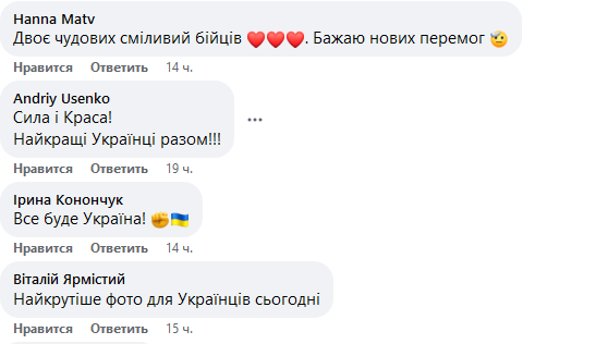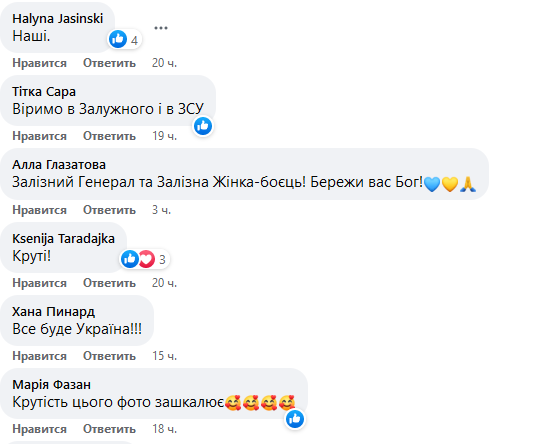 "Железный Генерал и Железная Женщина-боец! Береги вас Бог!", "Крутость этого фото зашкаливает", "2 больших патриота! Береги вас, Боже!", "Сила и Красота! Лучшие украинцы вместе!", "Самое крутое фото для украинцев сегодня", "Невероятное фото! Атаман Залужный и Княгиня Ольга", "Аж настроение улучшилось, спасибо", "Два больших человека. Приятно осознавать, что у нас есть такие личности", - пишут украинцы в комментариях.