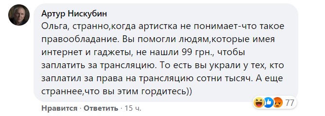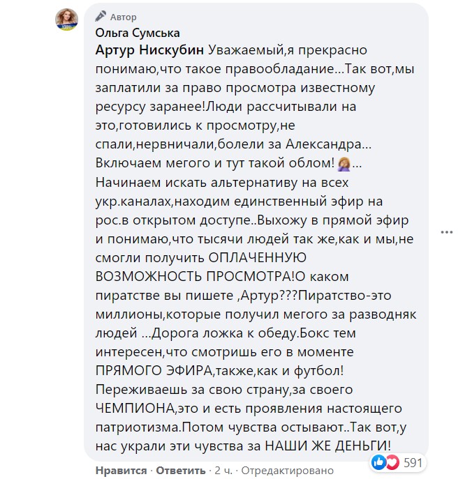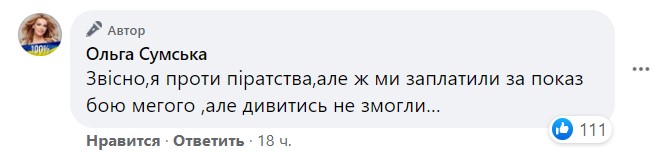 В комментариях под постом разгорелись споры: если одни подписчики благодарили актрису за стрим, другие стали ругать за очевидное правонарушение. "Конечно, я против пиратства, но мы заплатили за показ боя Megogo, но смотреть не смогли..." - ответила на это Сумская.