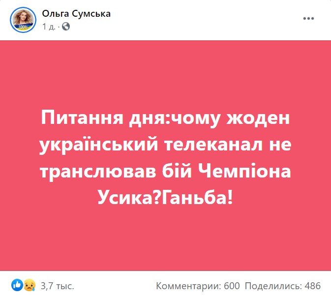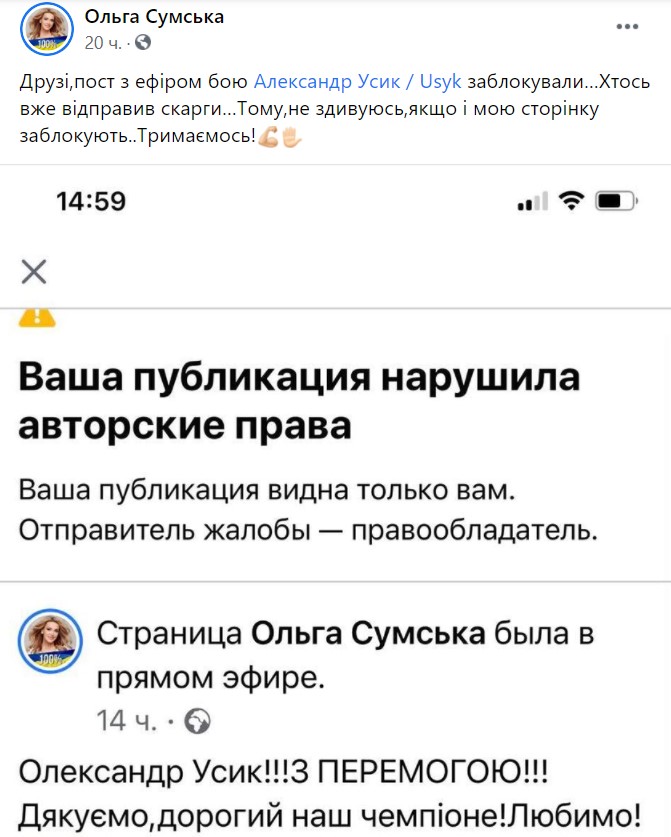 К трансляции Сумской подключились сотни пользователей соцсети, однако уже вскоре ее заблокировали за нарушение авторских прав. "Друзья, пост с эфиром боя Александра Усика заблокировали, - написала актриса на личной странице. - Не удивлюсь, если и мою страницу заблокируют".