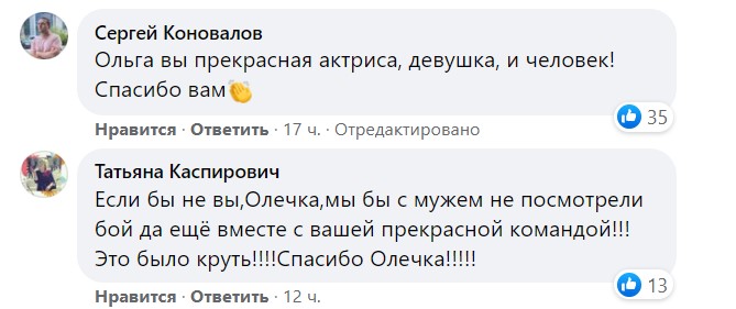 Актриса театра и кино Ольга Сумская оказалась в числе пользователей Megogo, которые не смогли посмотреть долгожданную трансляцию. Отыскав аналог на одном из российских телеканалов, Сумская со смартфона запустила онлайн-трансляцию боя на личной странице в Facebook и взяла на себя роль комментатора.