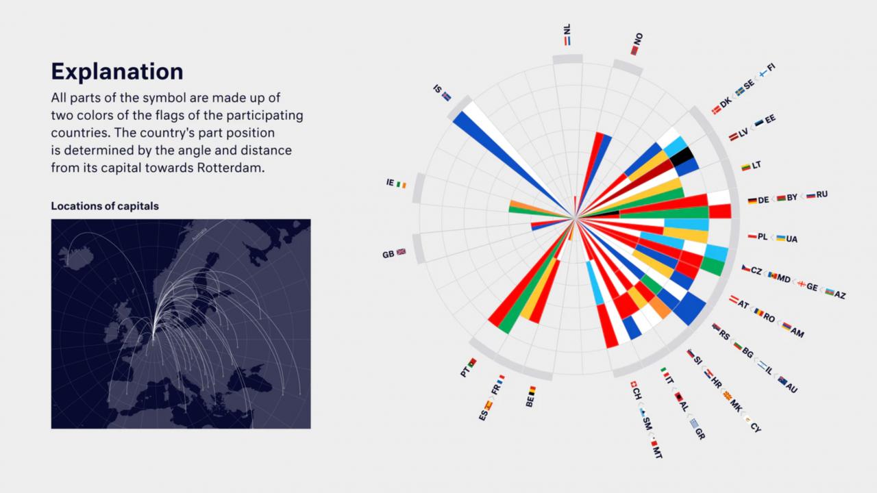 "Логотип соединяет Роттердам со столицами стран-участниц и символизирует объединение, независимо от формы", - говорит Ситсе Баккер, исполнительный продюсер мероприятия.