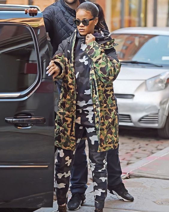 Рианна является поклонницей стиля "милитари" – в каждом втором повседневном образе можно встретить камуфлированную одежду цвета хаки. К тому же певица умудряется соединять в одном луке несколько разных его оттенков, что выглядит не очень с точки зрения моды и стиля. Ну, кто не ошибается в этой жизни?