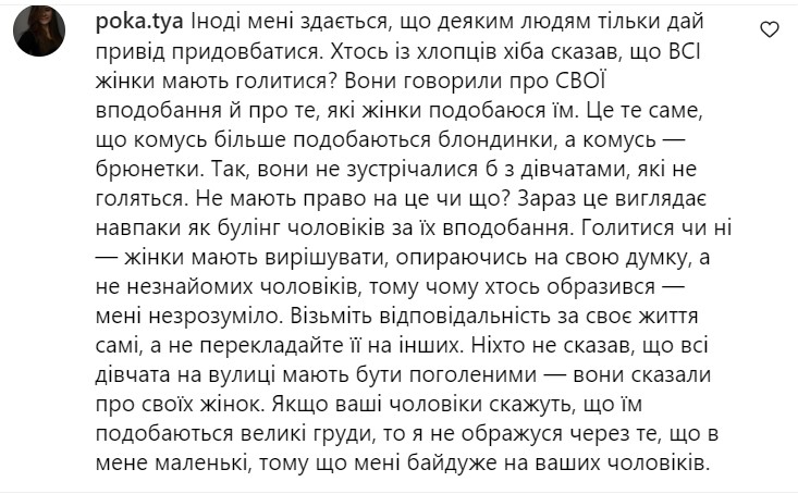 "Кажется, что все познания о женском теле они получили из подшивки журналов Maxim на запыленном чердаке. Эти три Кена до сих пор живут в кукольном мире, где волосы у женщин могут быть только на голове. Ведь уверены, что эпилируют себя все "нормальные" женщины. А если у нее где-то находятся волосы, она уже не может быть "десяткой"", - говорится в Instagram-публикации.