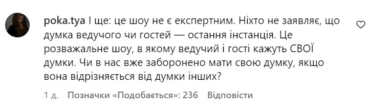 В комментариях под постом появилась и жена Остапчука, Екатерина Полтавская. Она защищала своего мужа и оправдывала его позицию тем, что он просто "выражал свое мнение".