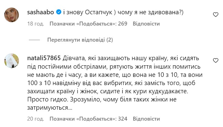 "Девушки, которые защищают нашу страну, которые сидят под постоянными обстрелами, спасают жизнь других, помыться не могут. А вы говорите, что она не 10 из 10. Да они 100 из 10 в отличие от вас, выбритых, которые вместо того, чтобы защищать страну и женщин, сидите и как куры кудахчете. Просто отвратительно", - пишут люди.