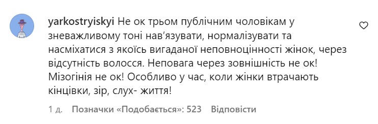 В коменти під пост Гендер Зед прийшла дружина Остапчука і захищає його) Каже що критика це БУЛІНГ