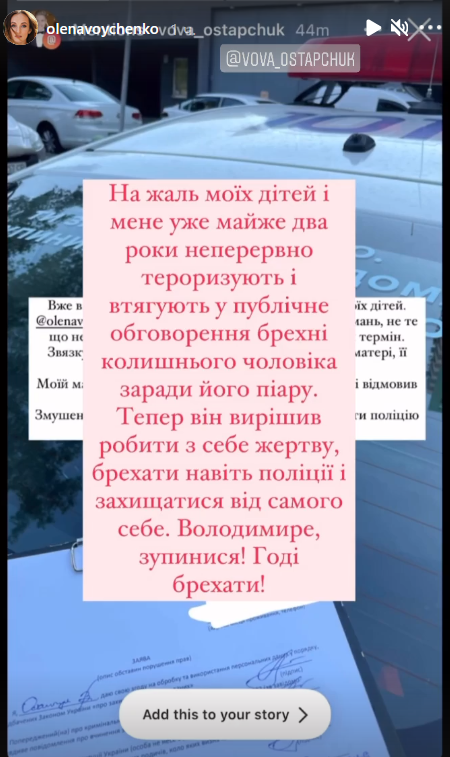Ответ Войченко не заставил себя долго ждать. "К сожалению, моих детей и меня уже почти два года непрерывно терроризируют и втягивают в публичные обсуждения лжи бывшего мужа ради его пиара. Теперь он решил делать из себя жертву, врать даже полиции и защищаться от самого себя. Владимир, остановись! Хватить врать", - написала она в "сториз".
