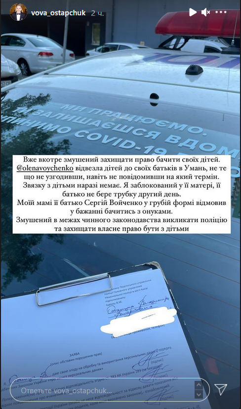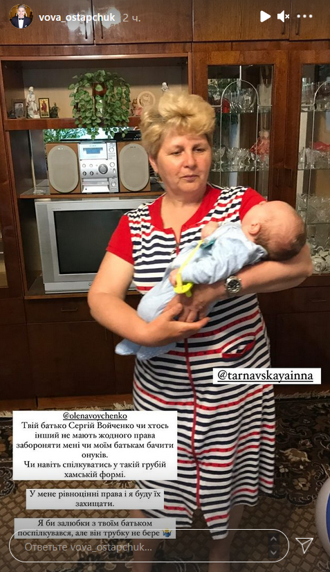 В следующей публикации Остапчук обратился лично к Елене. "Твой отец Сергей Войченко или кто-то другой не имеют никакого права запрещать мне или моим родителям видеть внуков. Или даже общаться в такой грубой форме. У меня равноценные права, и я буду их защищать", - написал звездный отец.