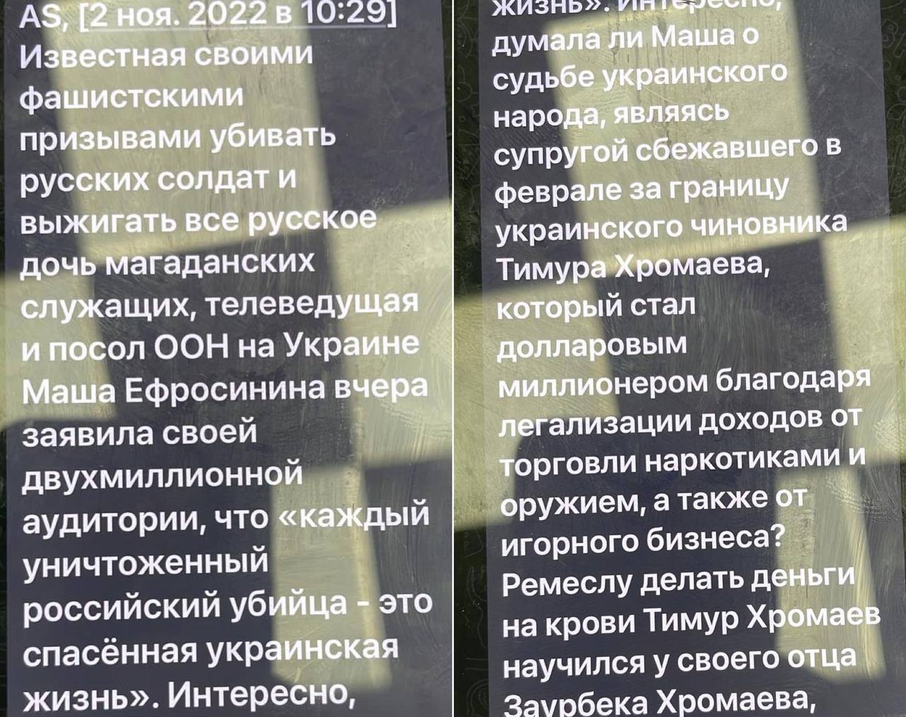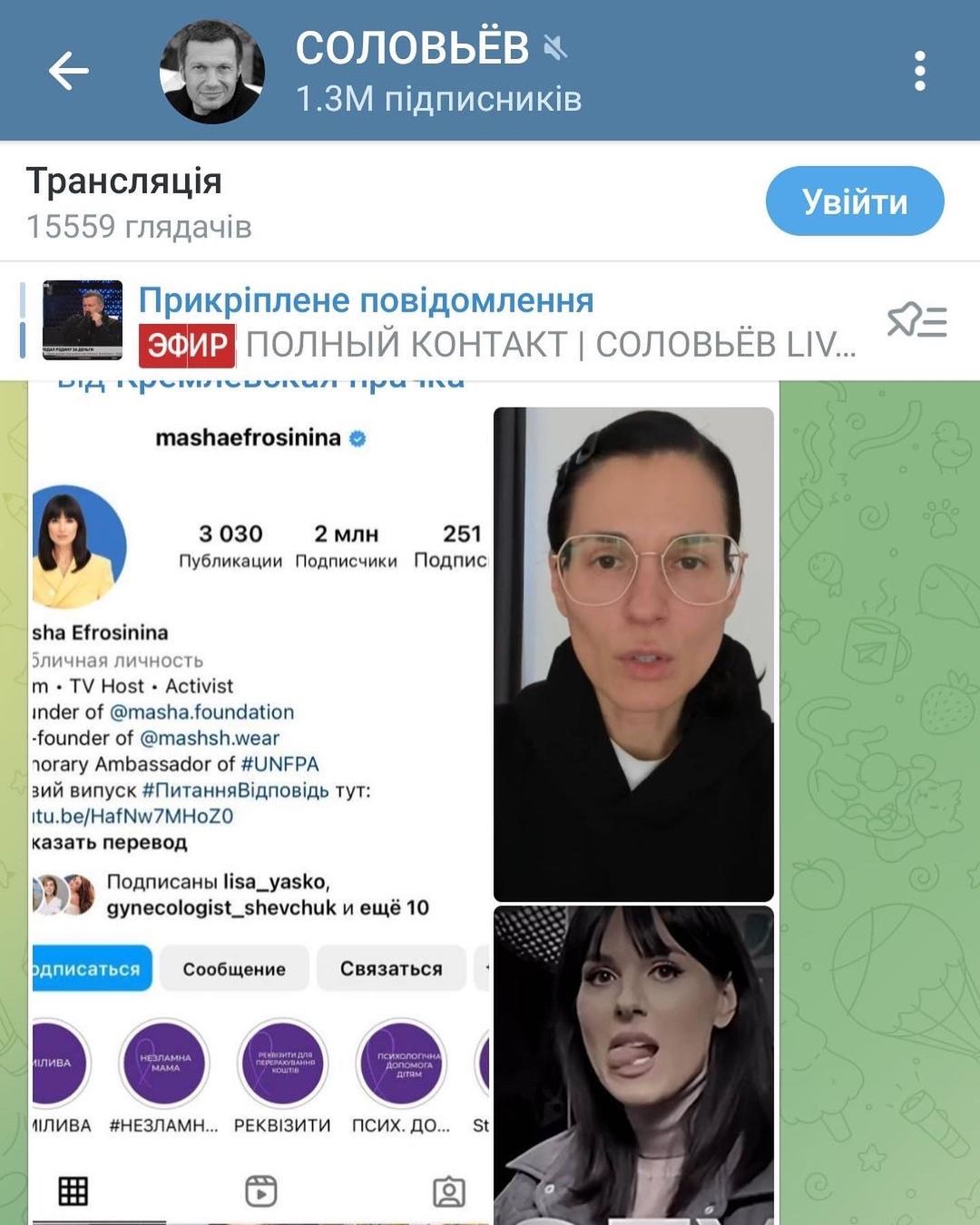Знаменитость опубликовала в Instagram скриншот поста Соловьева, в котором тот называет Машу Ефросинину "дочерью магаданских служащих", которая "призывает убивать русских солдат и выжигать все русское".