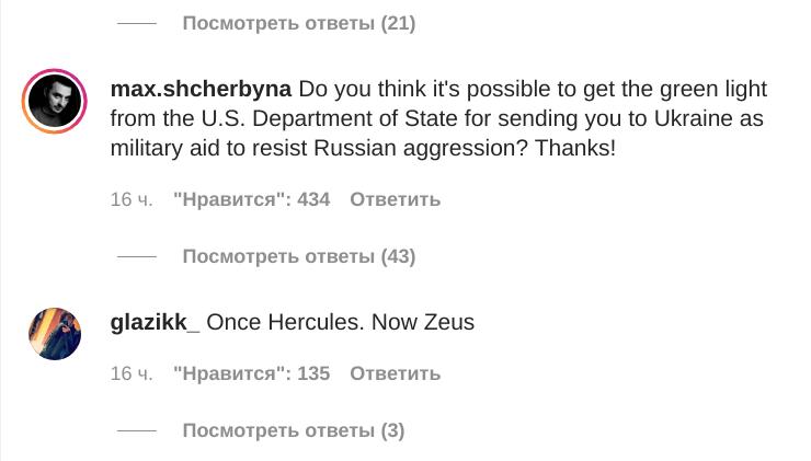 "Я не знаю, что это, но я одобряю", - пишут они. - "Арнольд в биографическом фильме". "Круг замкнулся, от Геркулеса до Зевса". "Как вы думаете, возможно ли получить от Госдепартамента США добро на отправку вас в Украину в качестве военной помощи для сопротивления российской агрессии? Спасибо!"
