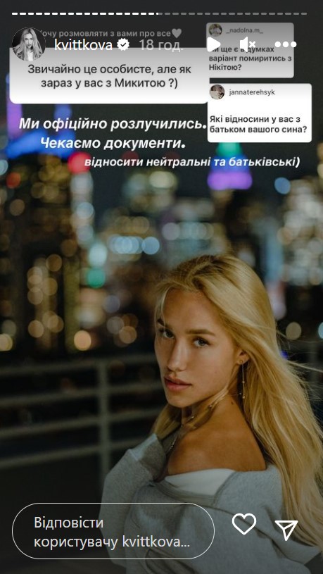 Этой новостью Квиткова поделилась с подписчиками в своем блоге в Instagram. "Мы официально развелись. Ждем документов. Отношения нейтральные и родительские", - отметила она.