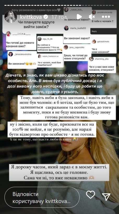"Девочки, я знаю, как вам интересно узнать о моем личном. Но у меня был публичный опыт, и я до сих пор разгребаю его последствия... Поэтому, даже если бы я была влюблена и у меня был бы мужчина, то хотела бы, чтобы это осталось тем сакральным и личным до того момента, пока не буду готова рассказать", – поделилась бывшая жена Добрынина.