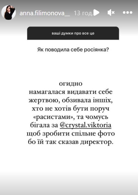 "Россиянка вела себя отвратительно. Пыталась строить из себя жертву, обзывала остальных, кто не хотел быть рядом, расистами, и почему-то бегала за Викторией Апанасенко, чтобы сделать общее фото. Потому что так ей сказал директор", - написала Филимонова в Instagram-сториз. Сама "Мисс Украина Вселенная" также разместила эту публикацию в своем блоге.