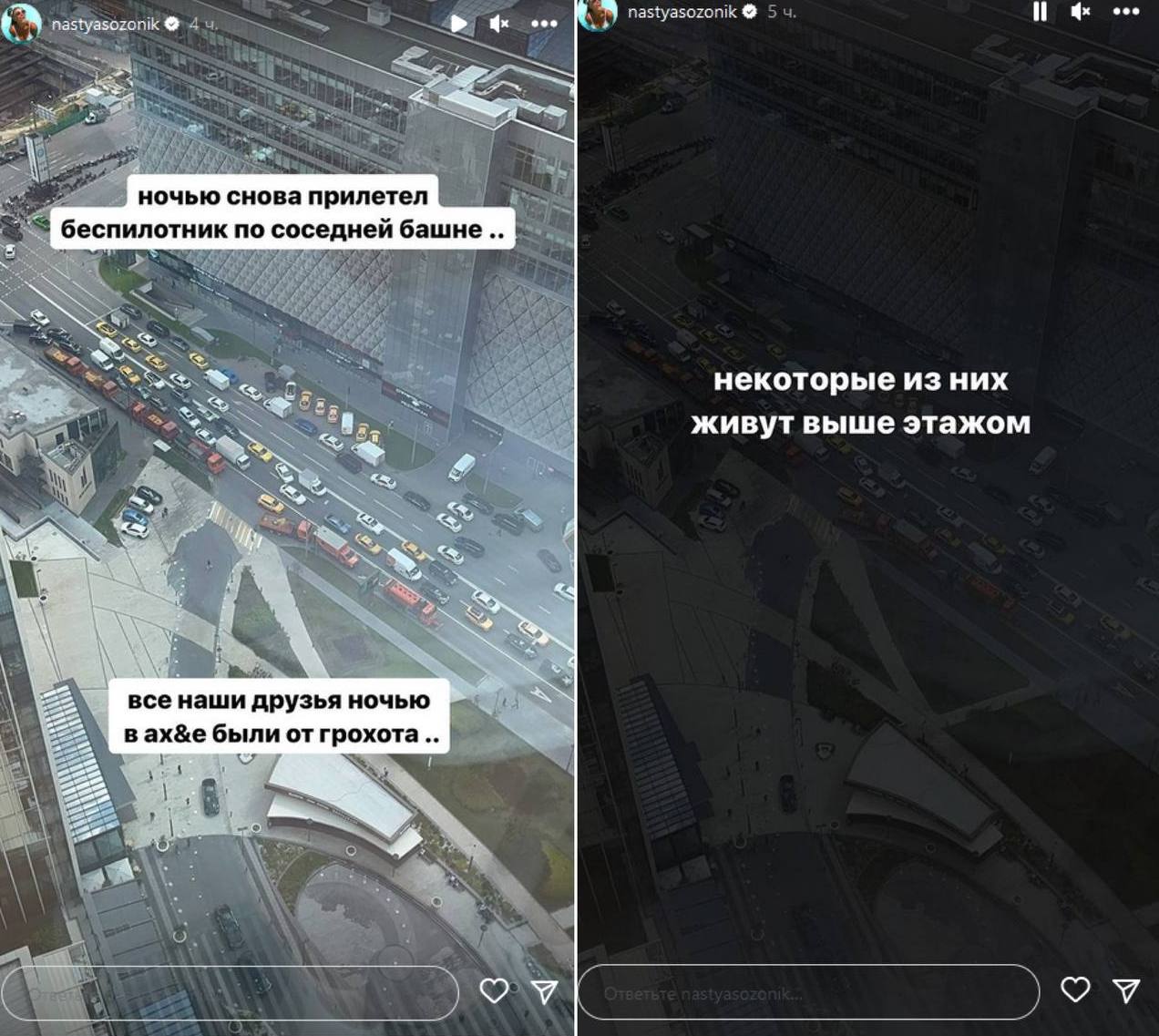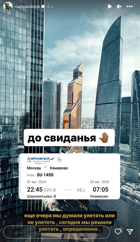 "Ночью снова прилетел беспилотник по соседней башне. Все наши друзья были в ах*е от грохота. Некоторые из них живут этажом выше. А мы спали. Еще вчера мы думали улетать или не улетать, но сегодня мы решили улетать, определенно", - сказала блогер своей 5,5 миллионной аудитории и показала билет в Кемерово на вечер 1 августа.