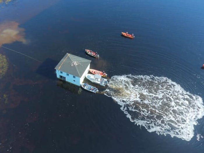 Пара из Канады выкупила старый дом в местном городке Макиверс на острове Ньюфаундленд, но жить решила на другой стороне залива. Переправить по воде все вещи и целый дом им помогли моторные лодки.