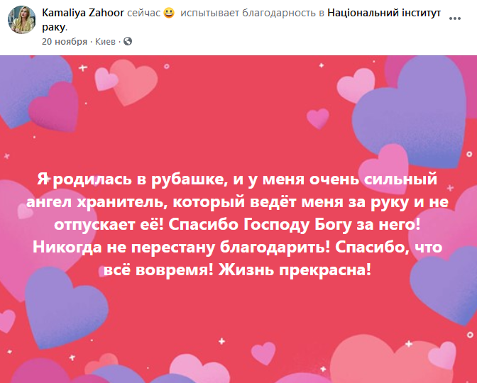 "Я родилась в рубашке, и у меня очень сильный ангел-хранитель, который ведет меня за руку и не отпускает ее! Спасибо Господу Богу за него! Никогда не перестану благодарить! Спасибо, что все вовремя! Жизнь прекрасна!" - написала артистка на своей странице в Facebook 20 ноября.