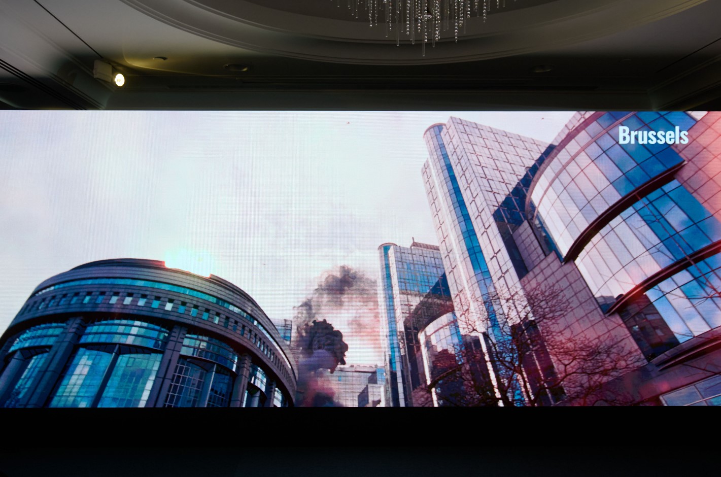 Третьим элементом экспозиции стал фильм, созданный с помощью искусственного интеллекта. В нем смоделирован возможный сценарий будущего Европы – атака российских дронов на столицы стран Европейского Союза.