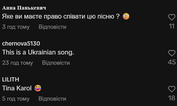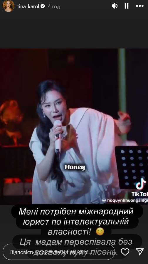 Интересно, что Хо Куин Хуонг исполняет не только песни Тины Кароль. В TikTok вьетнамской исполнительницы пользователи нашли видео, где она поет "Дикі танці" Русланы - трек, принесший Украине победу на "Евровидении-2004".