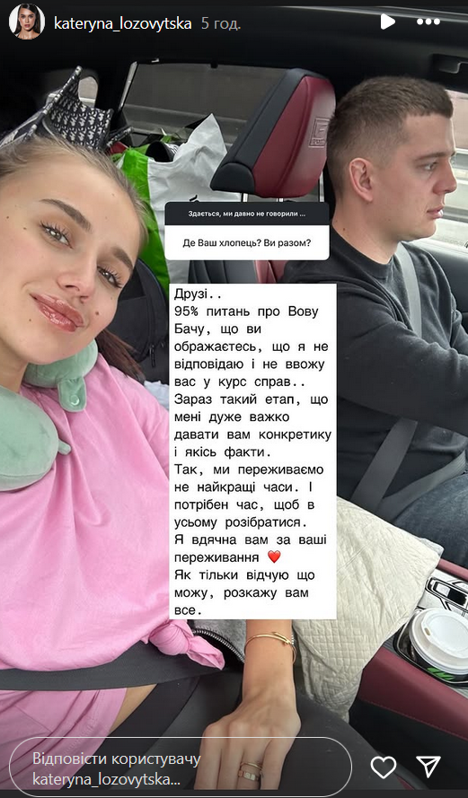 В октябре 2024 года победительница шоу "Холостяк-12" Екатерина Лозовицкая вместе со своим парнем вернулась в Киев из Польши, куда выезжала после начала полномасштабной войны в Украине. Спустя четыре месяца после возвращения домой, пара столкнулась с кризисом в отношениях.