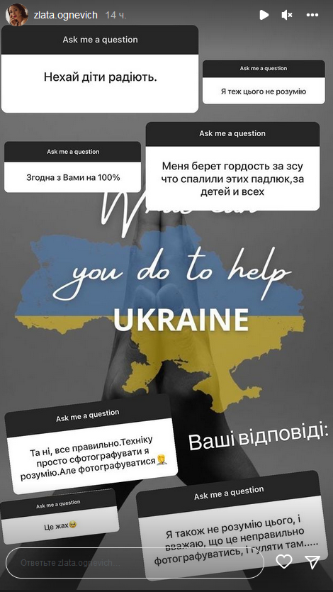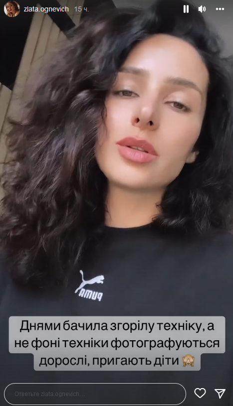 "Судя по вашим ответам на счет фото на фоне обгоревшей техники, я не одна думаю, что это гадко, противно и отвратительно. И мне очень приятно знать, как много у меня единомышленников. Спасибо вам, вы классные", - сказала Злата.