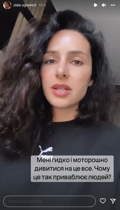 Свою позицию исполнительница высказала в Instagram-историях. Она рассказала, что недавно с сестрой прогуливалась по центру Киева и наткнулась на выставку военной техники РФ, разбитой украинскими бойцами. На фоне экспонатов гости мероприятия делают фото, прыгают дети.
