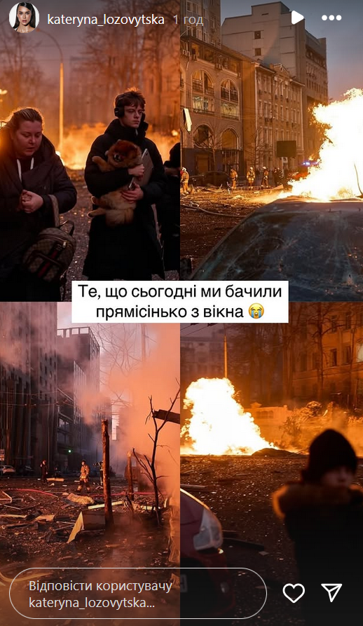 В следующей "сториз" она показала жуткие кадры, снятые очевидцами в центре Киева, и рассказала, что они с любимым видели это из окна своей квартиры. "То, что сегодня мы видели прямо из окна", - написала Лозовицкая.