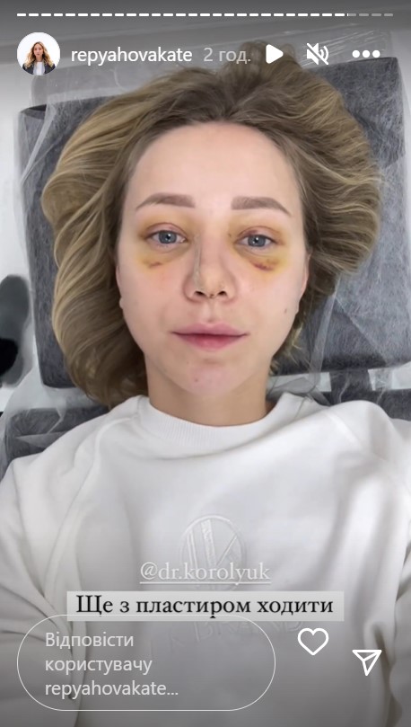 Репяхова поделилась, что пока ее нос еще отекший. Окончательно восстановить его форму удастся не раньше, чем через полгода. "Отек сойдет где-то через полгода. Еще с пластырем ходить", - уточнила она.