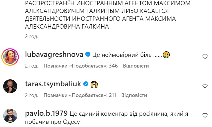 В комментариях украинцы, в том числе актеры Тарас Цымбалюк и Любава Грешнова, поблагодарили Галкина за поддержку Украины, а также четкую демонстрацию своей позиции. Некоторые написали, что шоумен - чуть ли не единственный россиянин, который отреагировал на трагедию в Одессе.