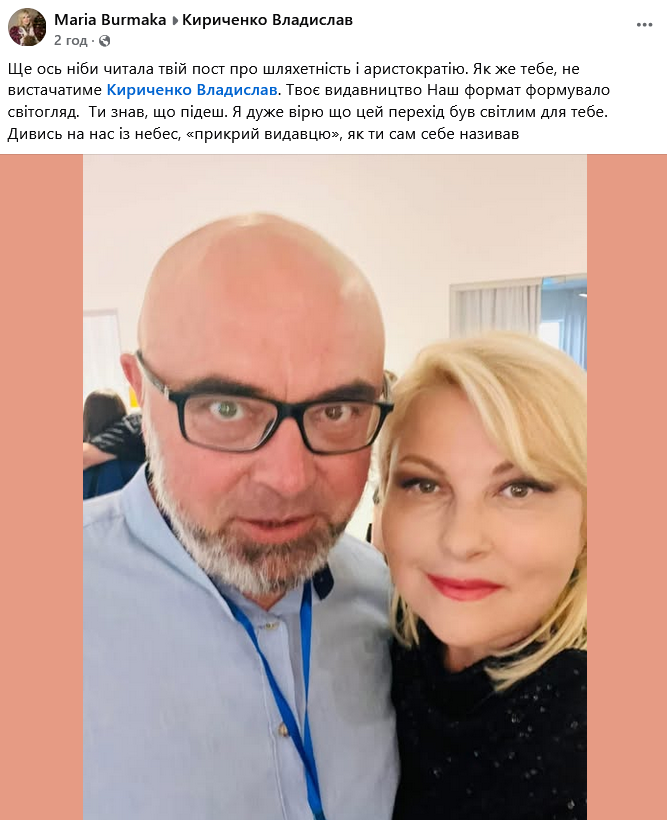 "Еще вот как будто читала твой пост о благородстве и аристократии. Как же тебя не хватает, Кириченко Владислав. Твое издательство Наш формат формировало мировоззрение. Ты знал, что уйдешь. Я очень верю, что этот переход был светлым для тебя. Смотри на нас с небес, "прикрой издателю", как ты сам себя называл", - написала певица Мария Бурмака.