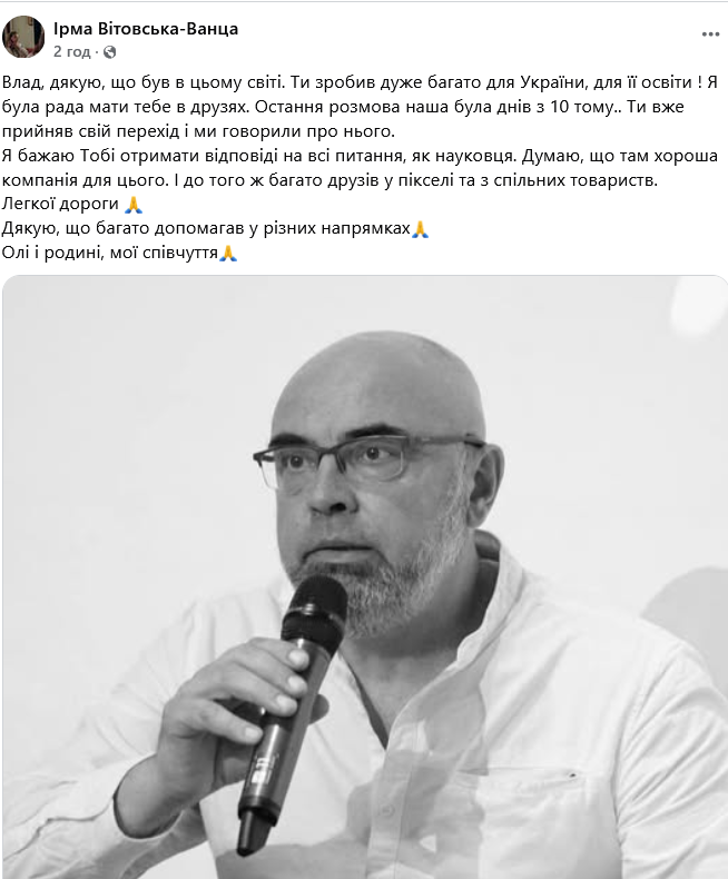 "Влад, спасибо, что был в этом мире. Ты сделал очень много для Украины, для ее образования! Я была рада иметь тебя в друзьях. Последний раз мы разговаривали дней 10 назад... Ты уже принял свой переход, и мы говорили о нем. Я желаю тебе получить ответы на все вопросы, как ученому. Думаю, что там хорошая компания для этого. И к тому же много друзей в пикселе и из общих кругов. Легкой дороги. Спасибо, что много помогал в разных направлениях. Оле и семье, мои соболезнования".